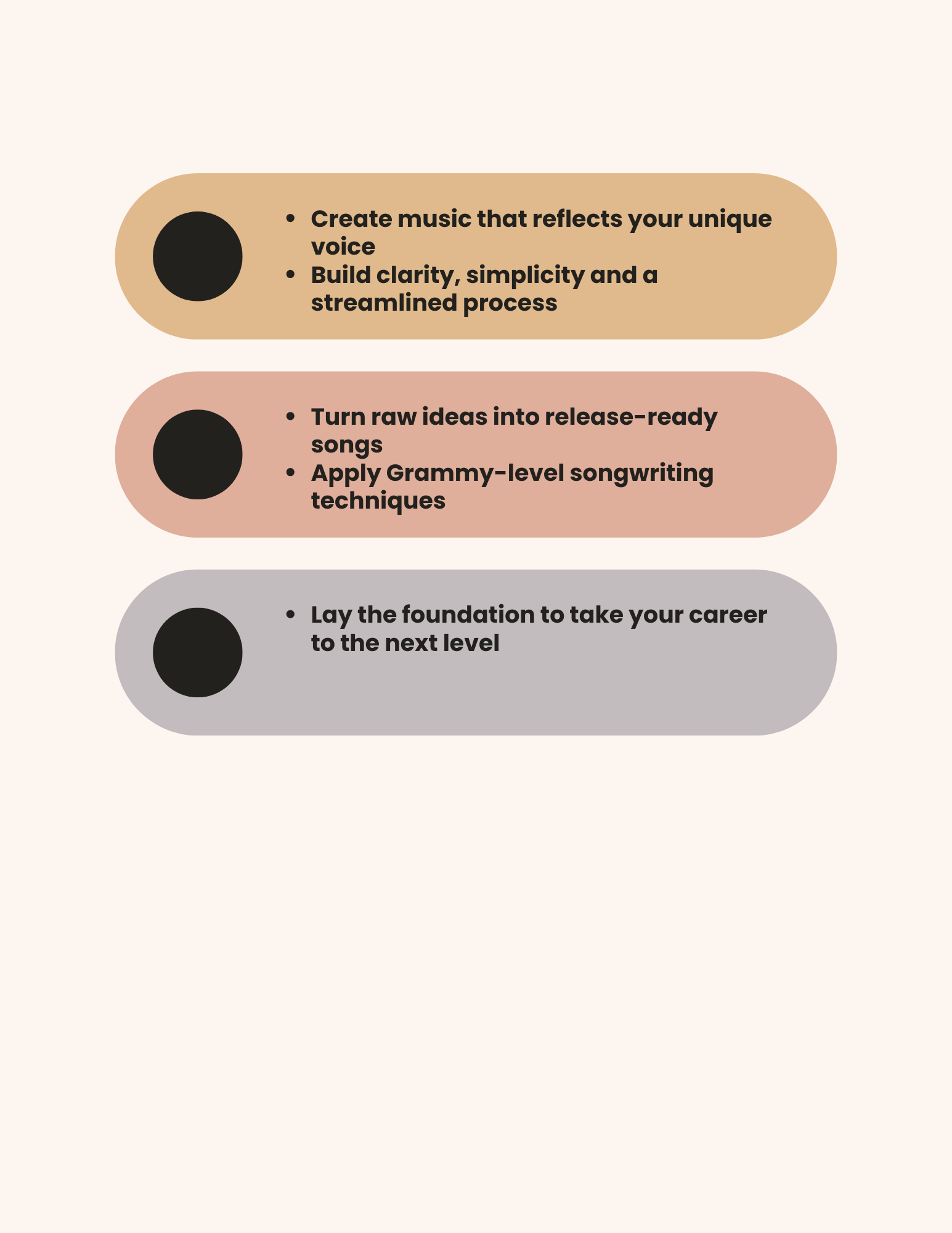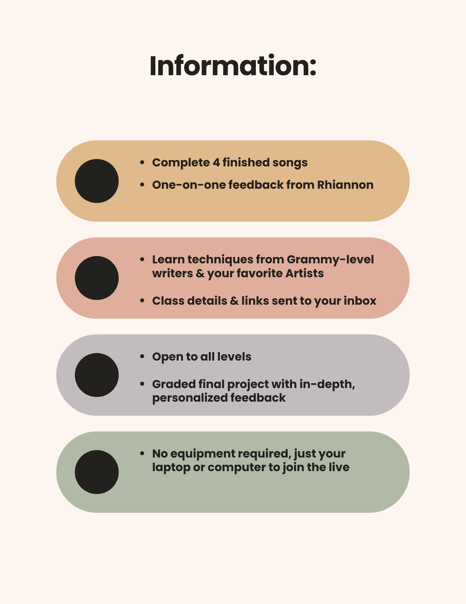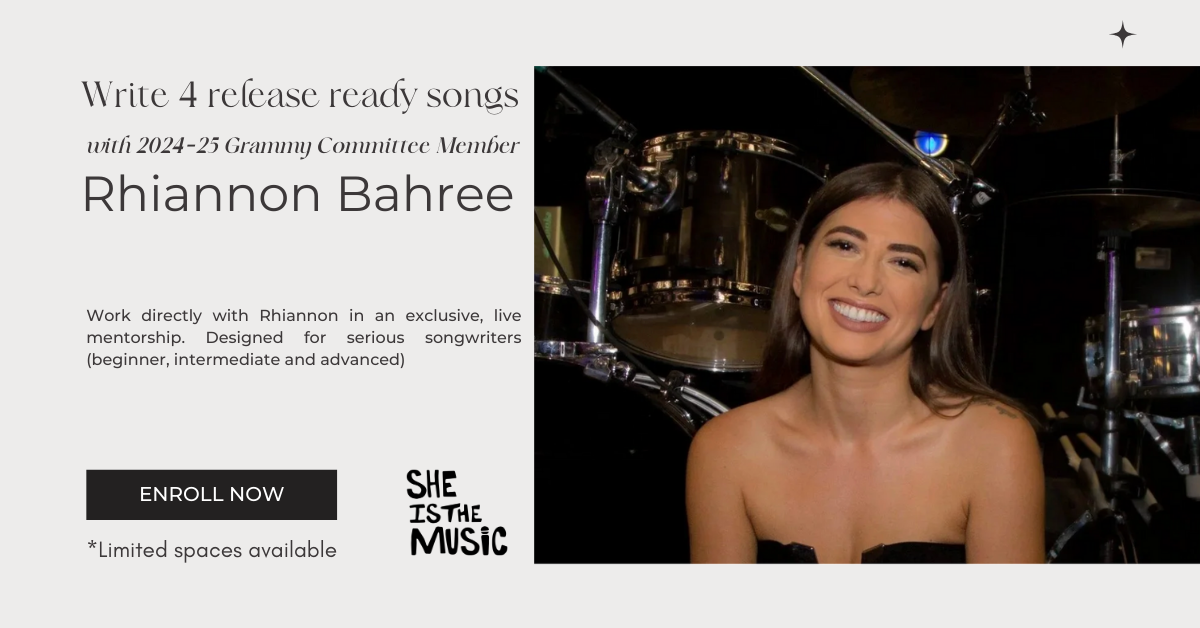 Join us for a live, focused, 4-week course with 2024 Grammy Committee Member, Rhiannon, giving you one-on-one feedback to help you develop your songwriting skills and leave you with 4 release ready songs. We'll cover foundational and advanced lyric writing, melodic writing, songwriting techniques, and much more, with an emphasis on writing and sharing original work, filled with examples that will inspire you on your songwriting journey. Open to all levels.
